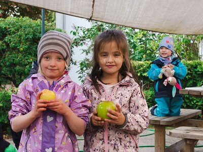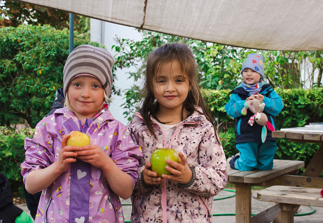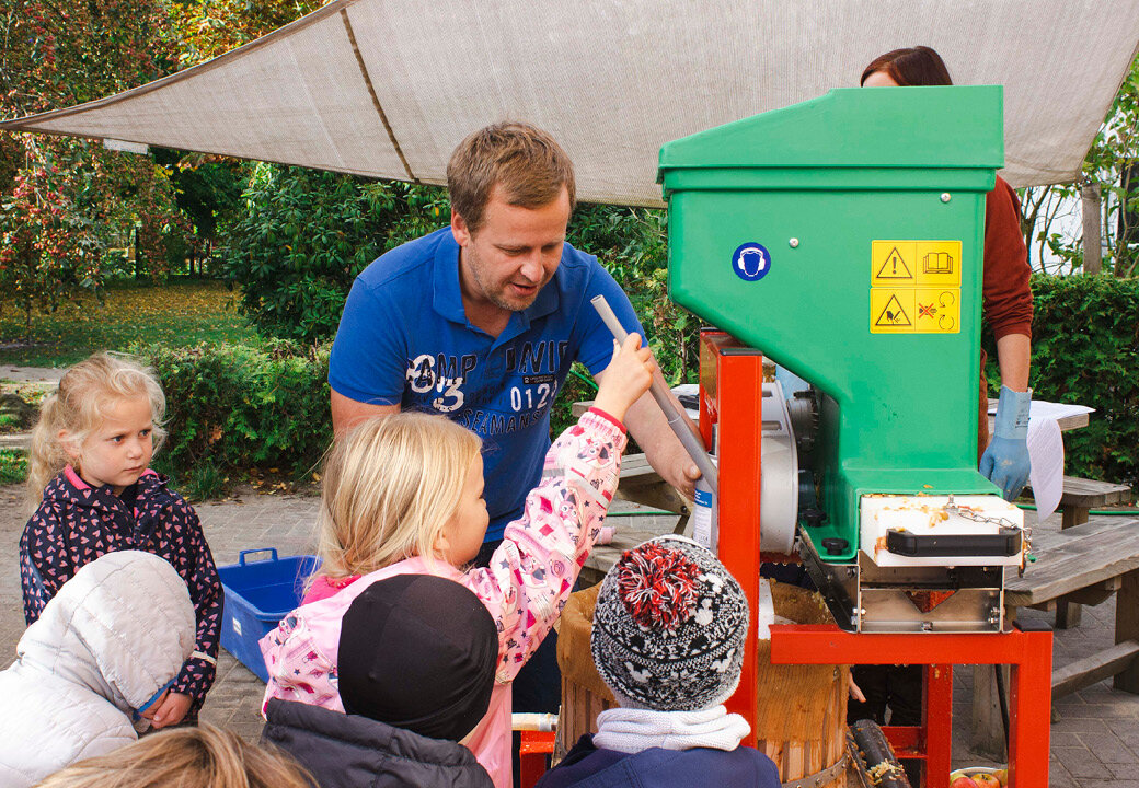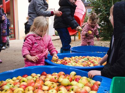Die Idee, auf dem Gelände Apfelbäume zu pflanzen und später aus den Früchten Saft zu produzieren, waren schon bei der Planung des Außengeländes der Kita im Jahr 2009 entstanden. Bis die Bäume reiche Ernte trugen, hatte es ein paar Jahre gedauert: 2020 konnten erstmals 60 Liter Apfelsaft produziert werden.