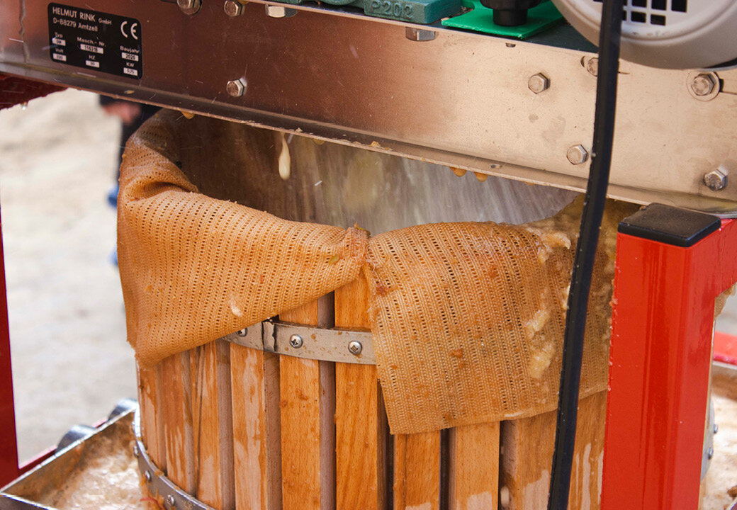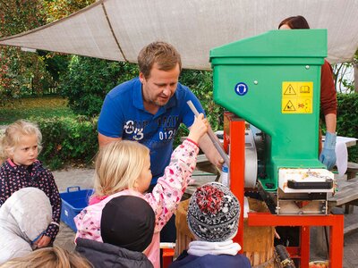 Unter strahlender Herbstsonne gab es auf dem Außengelände der Kita an der Dr.-Franz-Mertens-Straße reichlich zu tun für Jungen und Mädchen, für Erzieher*innen und einige fleißige Helfer*innen aus der Elternschaft: Zunächst mussten die Äpfel von den Bäumen gepflückt oder geschüttelt werden und im Anschluss zur nächsten Station transportiert werden. Dort wurden die großen und kleinen rot-grünen Früchte in mehreren großen Wannen ordentlich gewaschen. Für den nächsten Schritt war Maschinenkraft notwendig: In kleinen Portionen rollten die Äpfel in den Häcksler und wurden darin zerkleinert und landeten in der Presse. Viele Kinder konnten selbst mit eigener Muskelkraft an der Pressvorrichtung pumpen, um aus den Äpfeln die letzten Tropfen herauszubekommen.